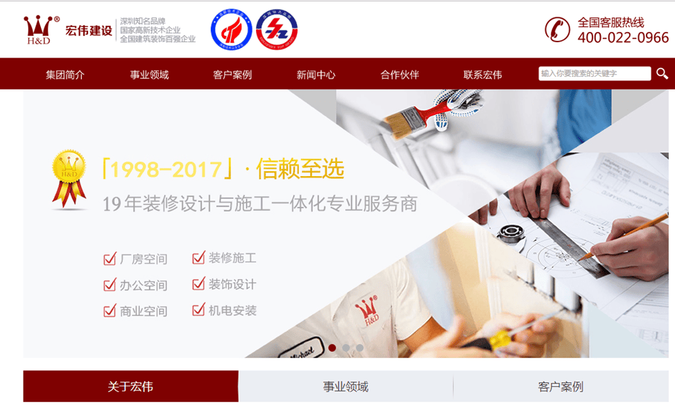 宏伟建设工程股份有限公司成立于1998年,注册资金6200万元人民币,于2015年从深圳市宏伟装饰工程有限公司更名为现公司名.宏伟建设是一家集装饰、净化、空调、通风、环保节能、机电、水电工程和相应材料供应为一体的综合性企业.多年来一直专注于工厂、办公室、别墅、酒店、场馆、学校、医院等商务和公共场所的装修设计施工,也能为企业及单位提供机电安装、无尘净化、楼宇自控等服务...