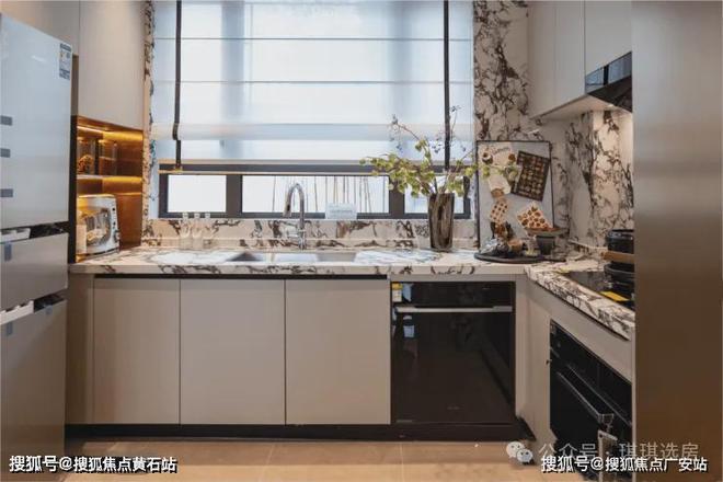 加上三面采光的效果,室内特别敞亮通透,换个角度欣赏下,透过IMAX级宽幕采光面,户外美景尽收眼底。厨房U型操作台面,操作便捷,并预留了双开门冰箱位置。